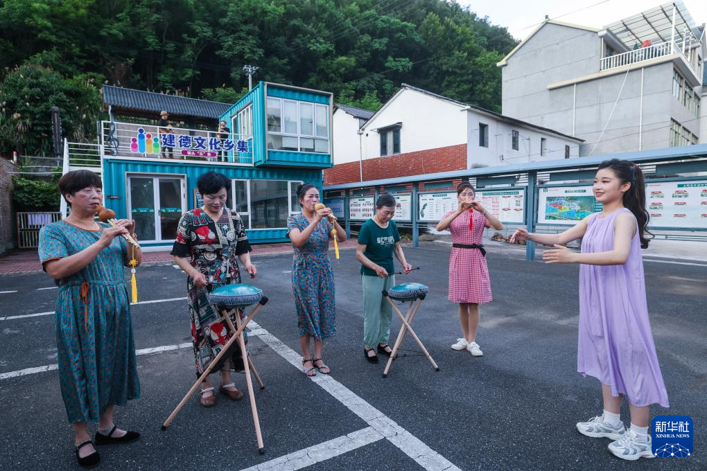 6月15日,杭州师范大学音乐学院的学生(右一)在三都镇镇头村指导村民进行空灵鼓、葫芦丝合奏。