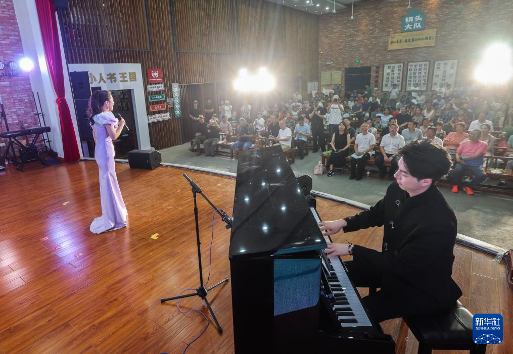6月15日,在建德市三都镇镇头村文化礼堂内举行的乡村音乐会上,来自杭州师范大学音乐学院的学生为村民表演节目。