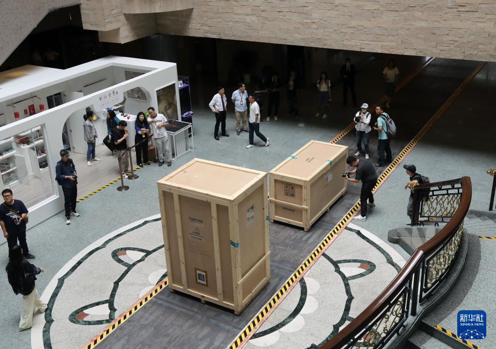 6月17日,在上海博物馆人民广场馆,工作人员打开彩绘人形棺的包装箱。