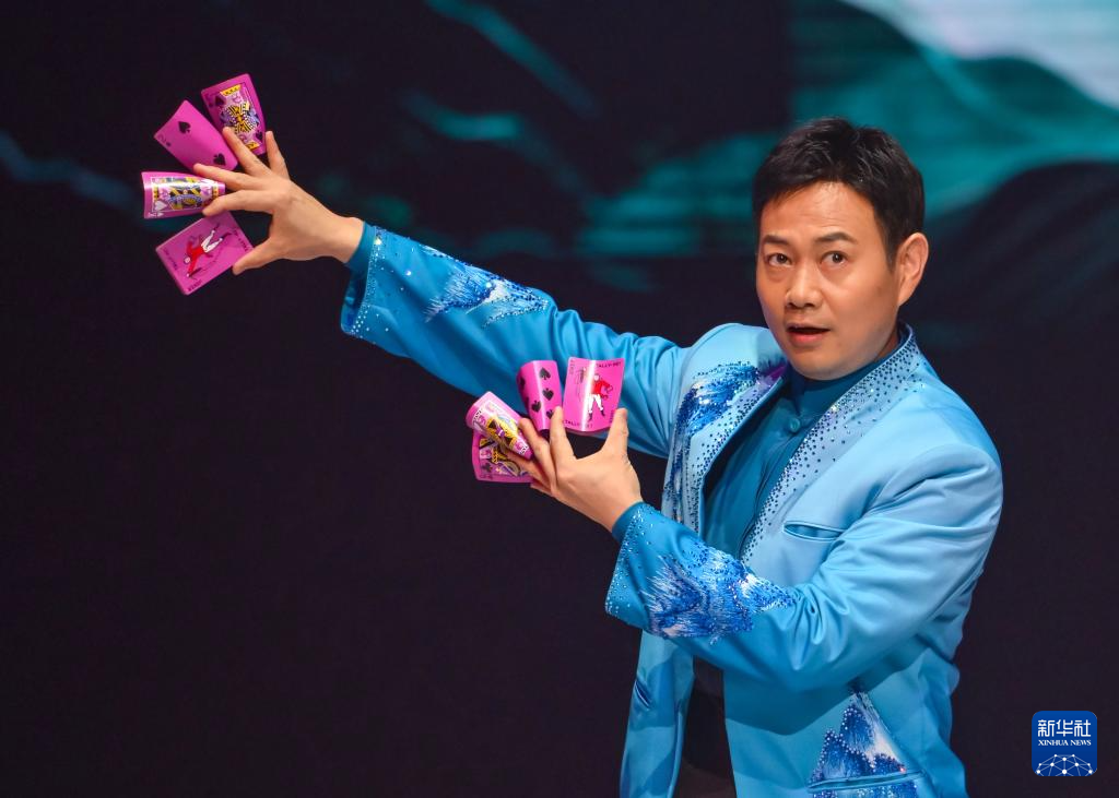 6月18日,在第十二届中国杂技金菊奖全国魔术·滑稽比赛开幕式上,上海杂技团演员刘明亚表演魔术《妙韵——手彩》。