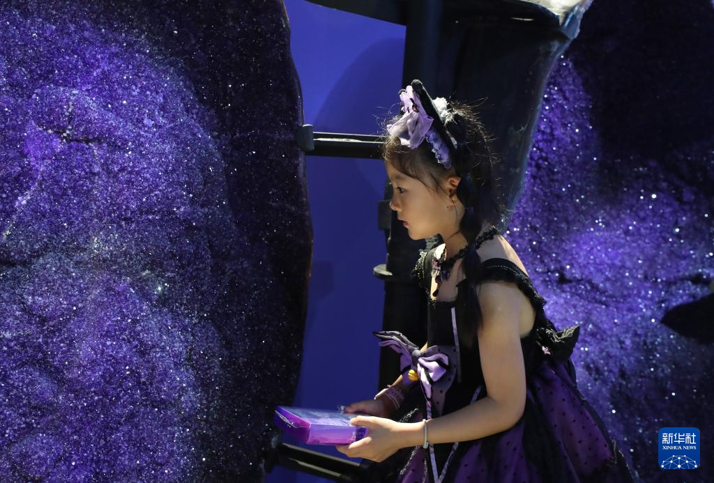 7月16日,参观者在一组产自巴西的玛瑙外壳紫水晶球体展品前驻足观看。