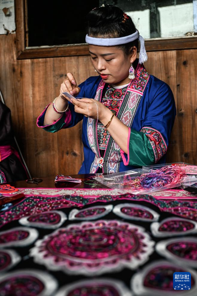 在广西三江侗族自治县,侗族刺绣是一种集纺织、印染、剪纸、刺绣于一体的传统手工艺,其绣品图案精美、色彩艳丽,成为助力侗乡民众增收的特色产业。