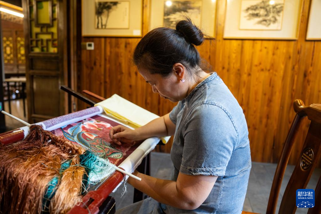 9月3日,在常德河街,桃源刺绣非遗传承人罗明华展示刺绣技艺。