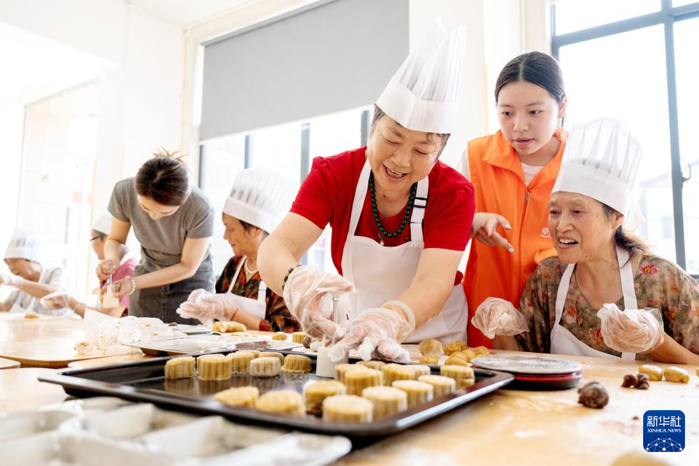 9月12日,浙江省湖州市长兴县林城镇百叶龙社区老年学堂,老年人将压制成型的手工月饼放入烤盘。