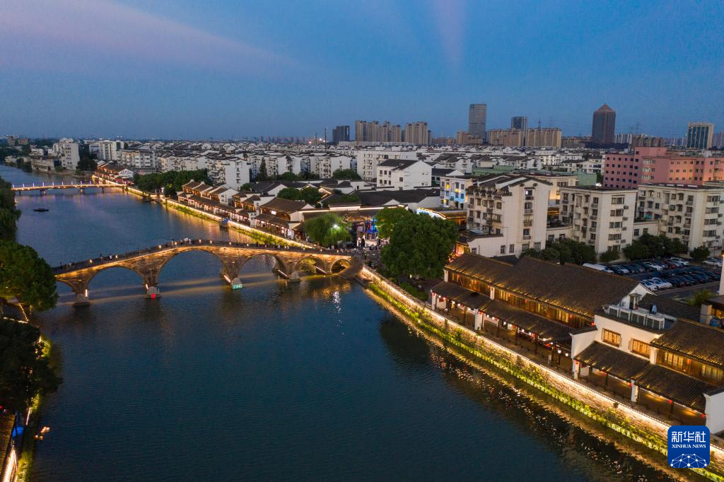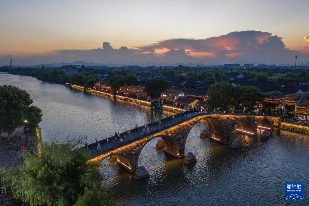 9月13日,空中俯瞰塘栖广济桥和大运河(无人机照片)。