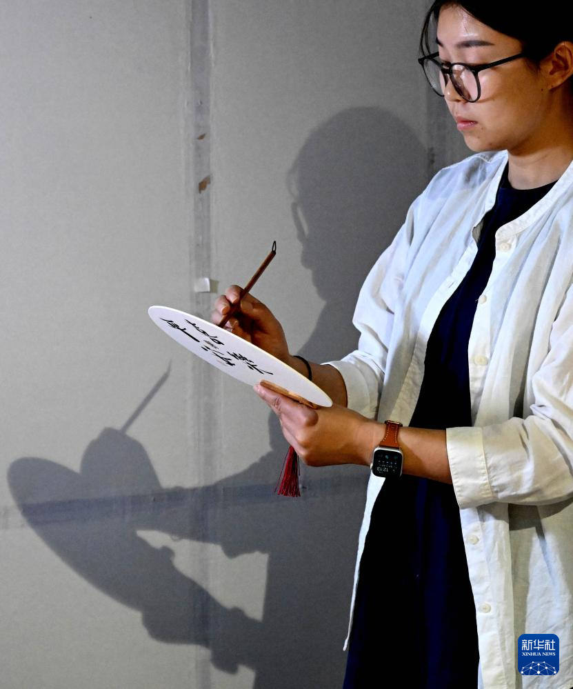 钱夏玉在洛阳华夏金石文化博物馆内进行金石博古画文创团扇创作(9月11日摄)。