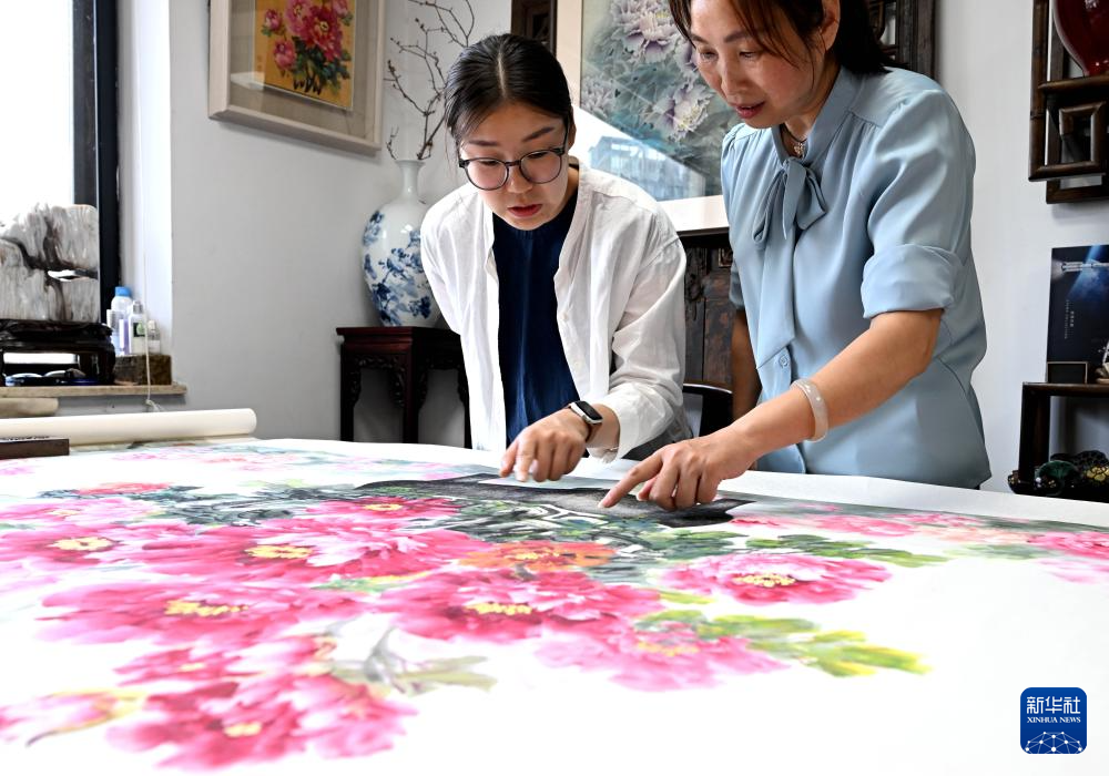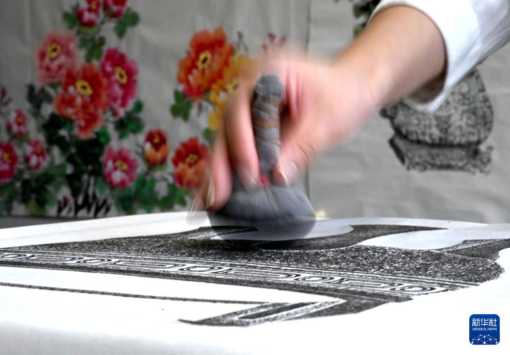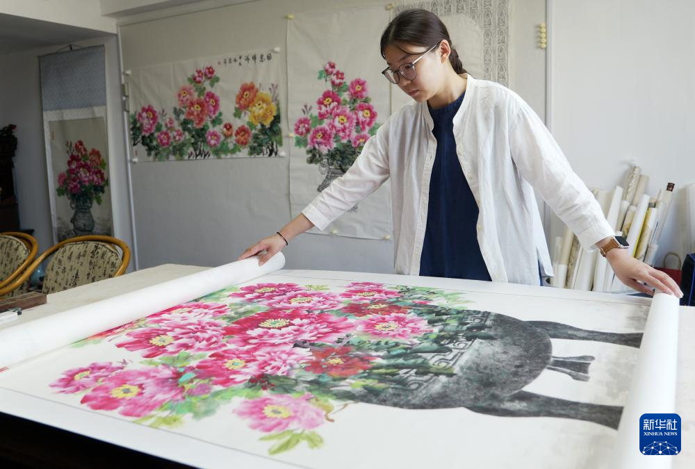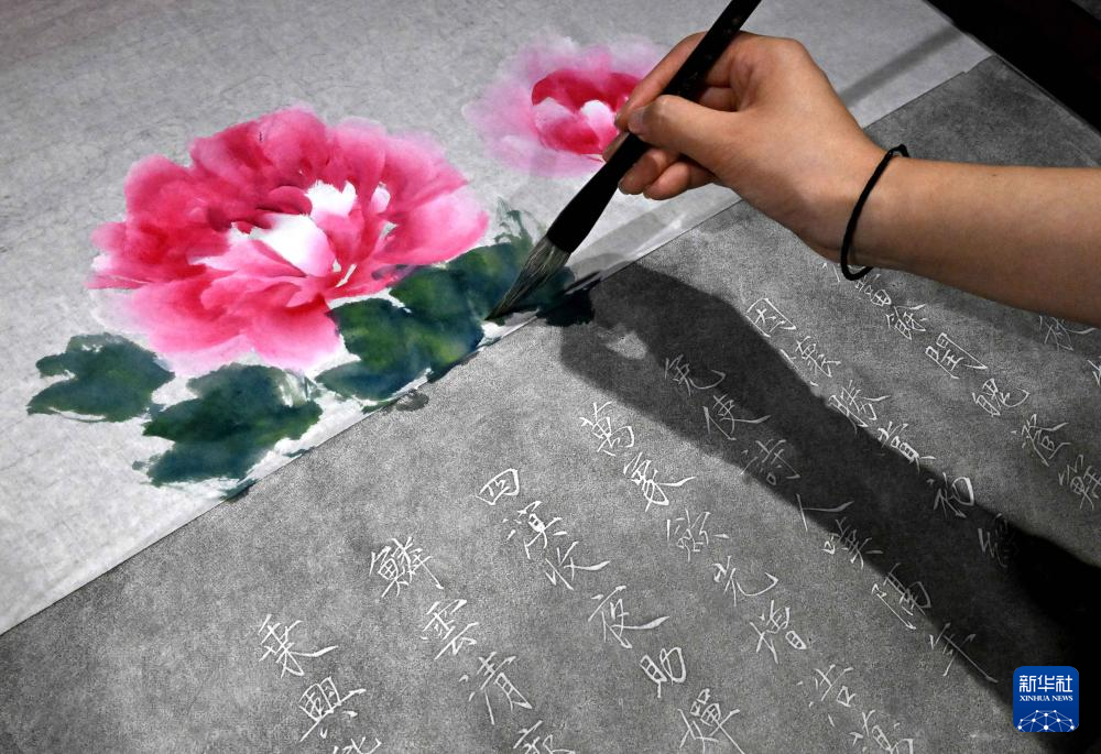在洛阳龙门画院,钱夏玉在拓印完成的金石拓片上补绘牡丹画(9月11日摄)。
