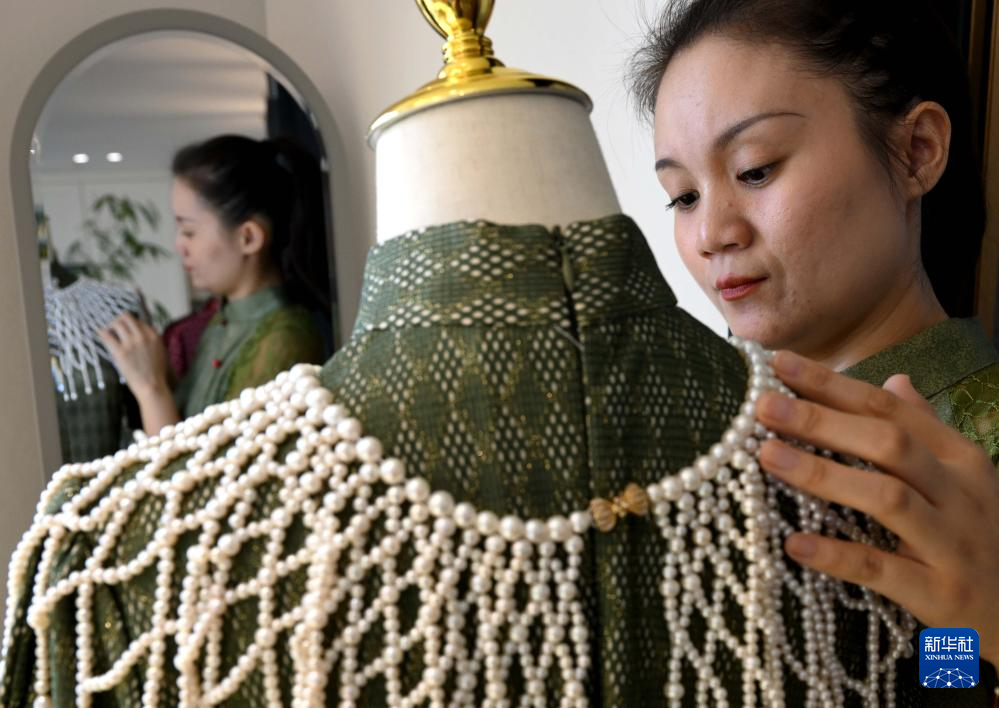 楚蒙丹在位于洛阳市的非遗体验馆里整理珍珠衫与服装的贴合度(9月12日摄)。
