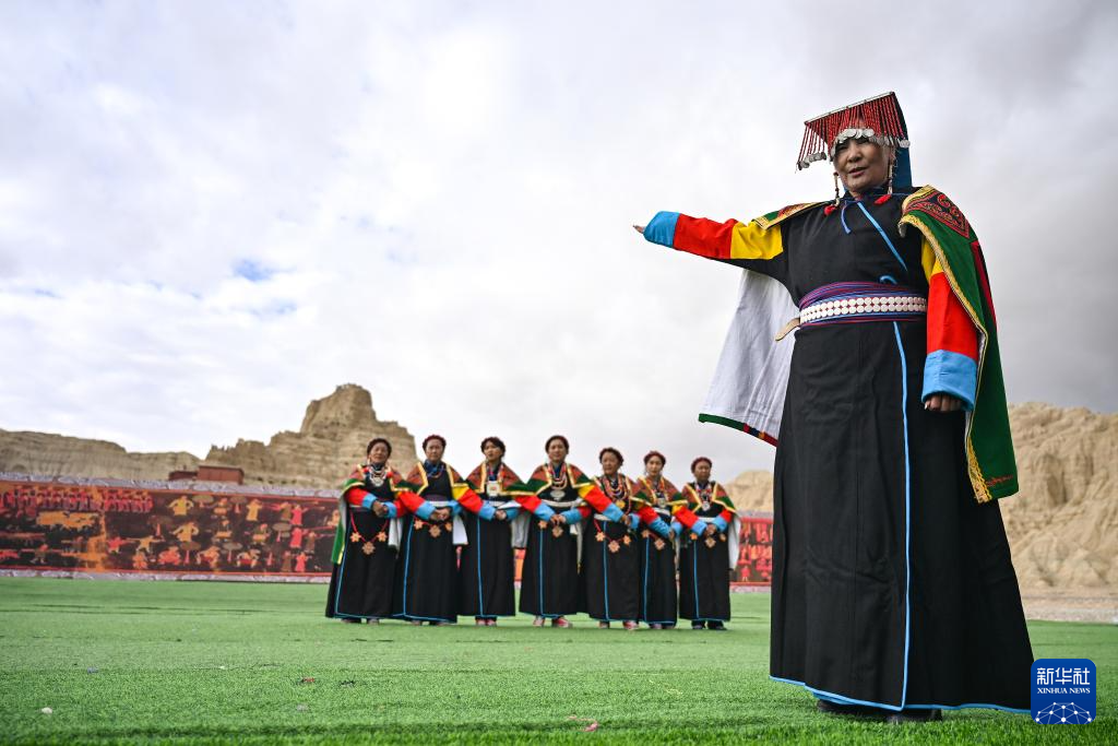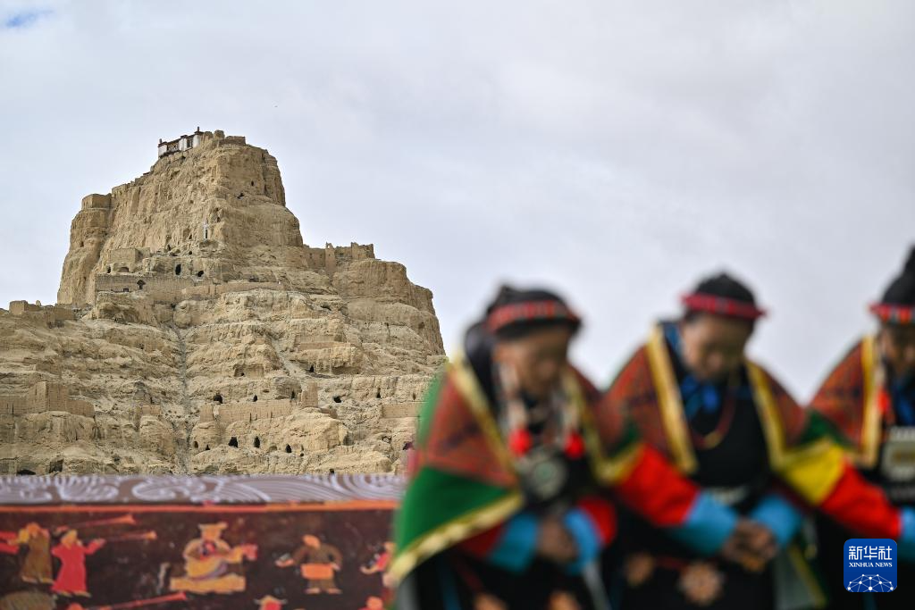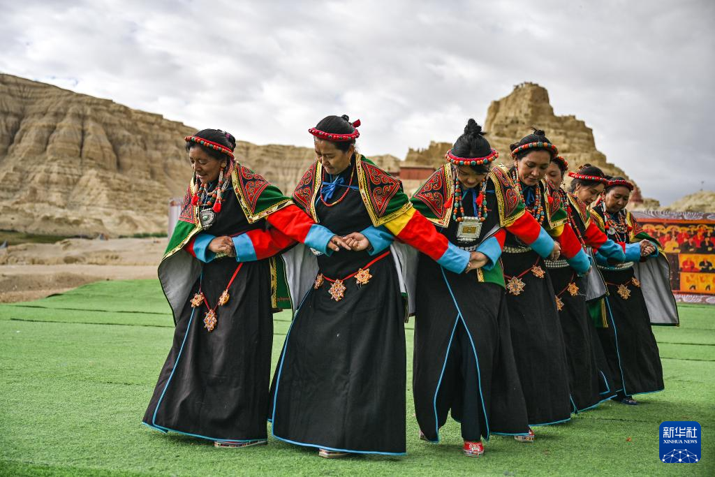 在西藏阿里地区札达县古格王国遗址脚下,当地村民表演“宣舞”(9月11日摄)。