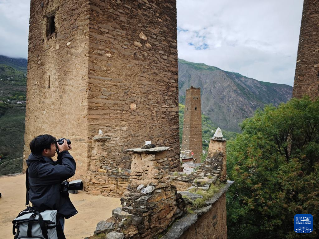 10月11日,一名大学生在丹巴县拍摄藏族古碉群。