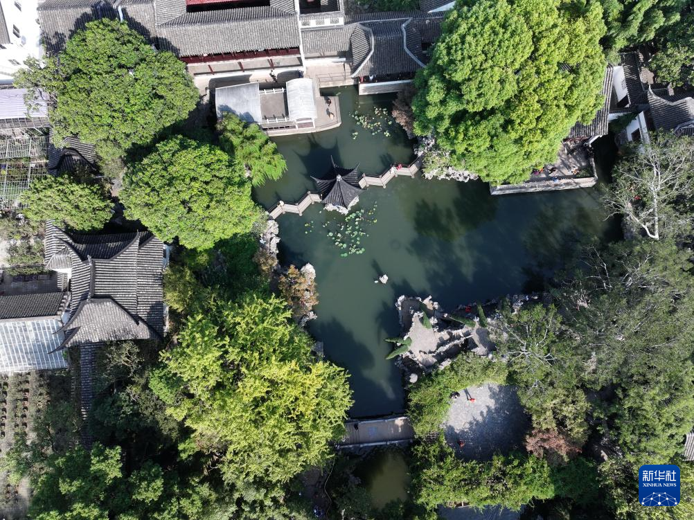 苏州园林西溪环翠游览景色(10月23日摄,无人机照片)。西溪环翠位于虎丘西南麓。