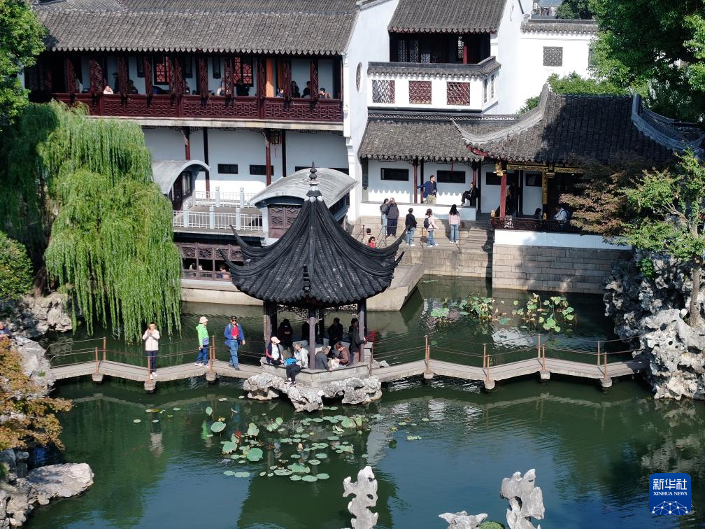 游人在留园参观游览(10月23日摄,无人机照片)。