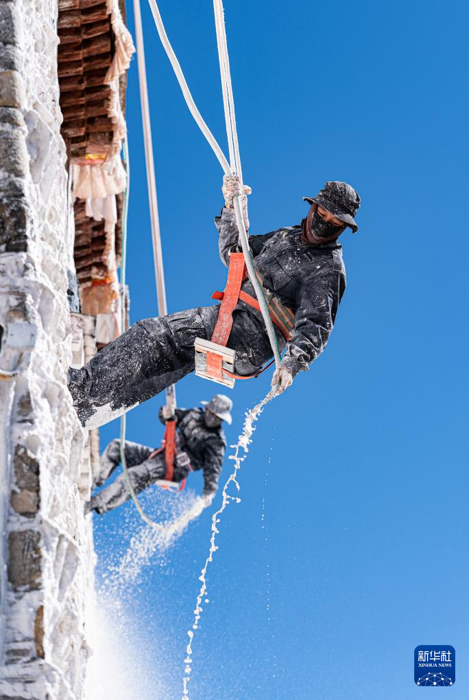 10月28日,布达拉宫管理处的工作人员在喷洒涂料。