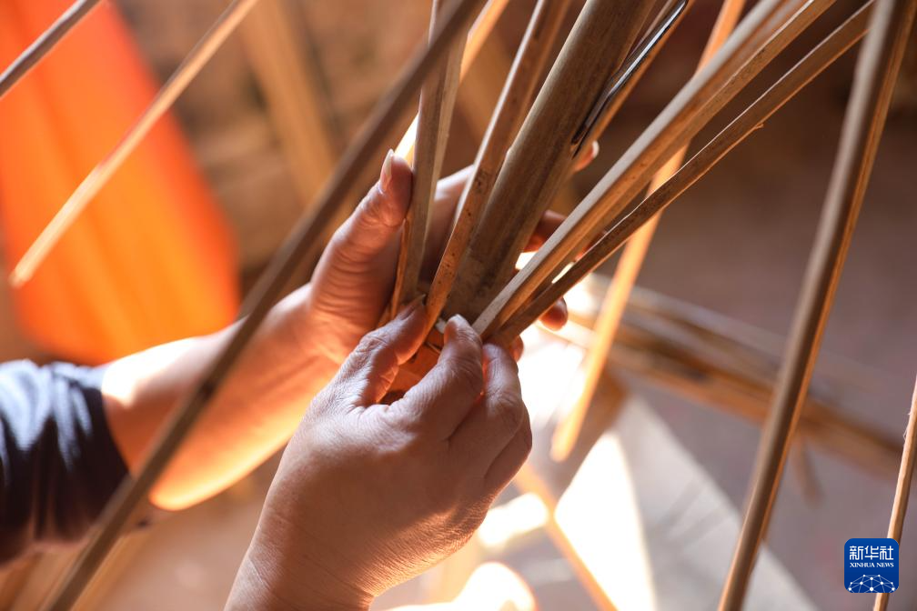 11月13日,在泾县昌桥乡孤峰村,国民油布伞厂的工人在制作伞骨。