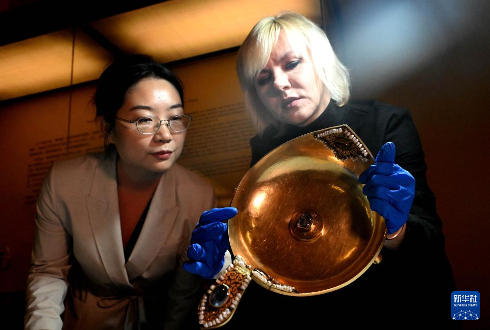这是即将展出的船形杯局部(11月13日摄)。船形杯是古代俄罗斯最具特色的容器之一。在宴会上,船形杯被用来盛放最受欢迎的俄罗斯饮料——蜂蜜或蜂蜜酒。