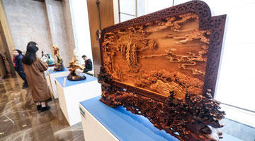 虞金顺在艺术馆观看自己创作的乐清黄杨木雕作品展览(11月25日摄)。