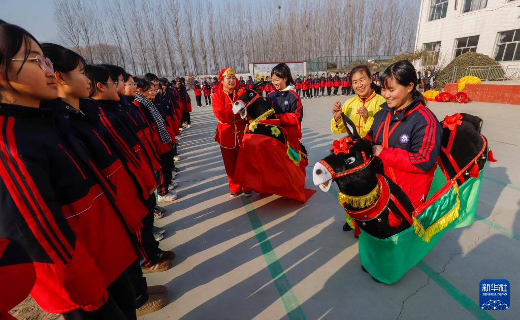 新年将至,河北省遵化市苏家洼镇的民间艺人开展民俗表演进校园活动,他们来到当地的下石河中学,为学生表演舞狮、舞龙、赶驴、跑旱船等传统民俗节庆节目,为学生讲解民俗表演技巧,学生们在观看、了解、体验中感受传统文化的魅力。