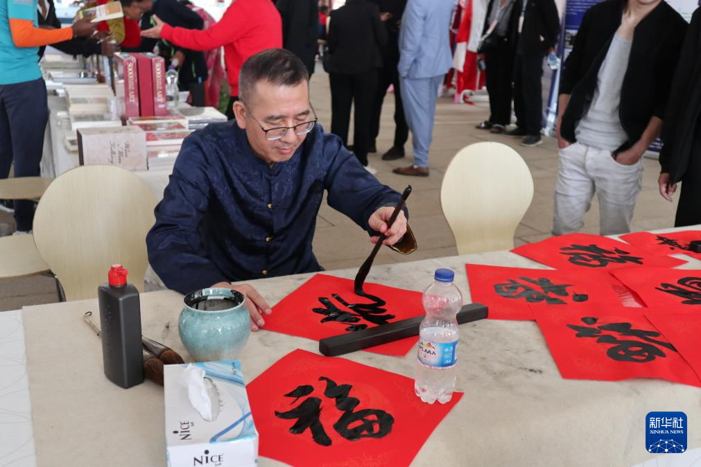 1月12日,在埃塞俄比亚首都亚的斯亚贝巴友谊广场,中国土木埃塞俄比亚工程有限公司的工作人员在“庆祝中埃塞建交55周年暨欢乐春节活动”现场表演书法。