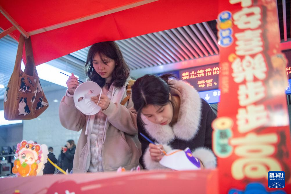 1月23日,在重庆北站候车厅内的新春集市上,候车旅客在画脸谱。