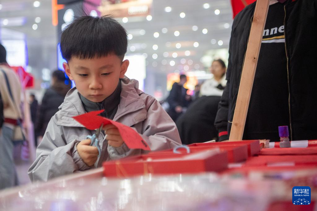 1月23日,在重庆北站候车厅内的新春集市上,一名小朋友在学剪窗花。