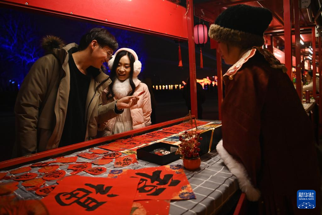 1月22日晚,游客在西安大明宫国家遗址公园灯会上逛国潮集市。