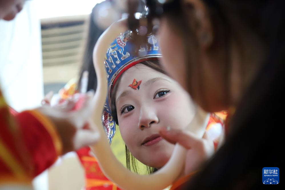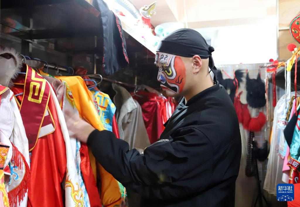 1月29日,英歌队员在广东汕头潮阳区桃园英歌训练基地穿戴演出服装。