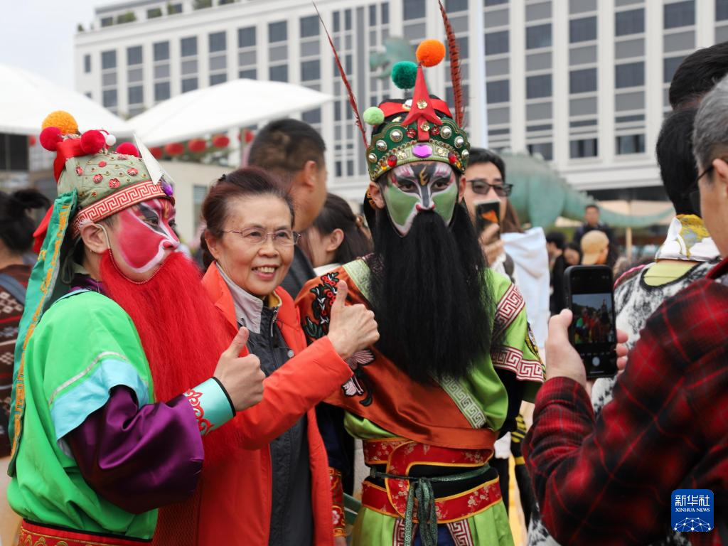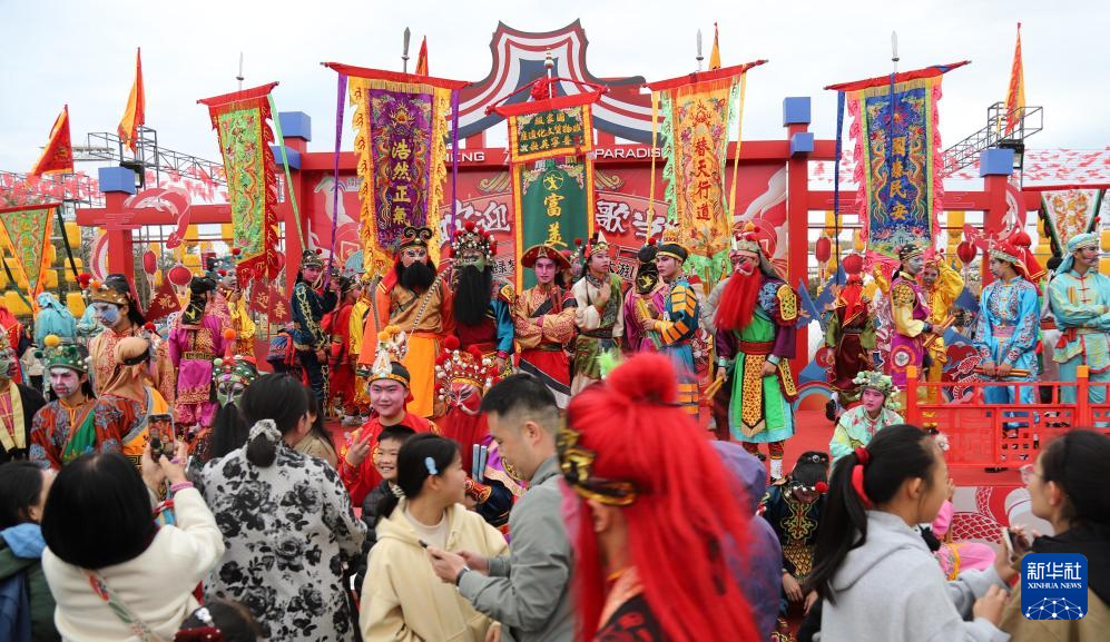 1月26日,在广东汕头金平区绿梦生态园,游客竞相与英歌队员合影。