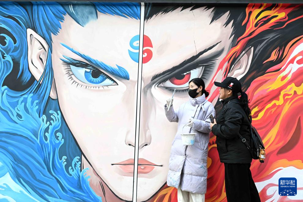 2月19日,画师(右)在石家庄市裕华区富强大街与塔南路交口处创作哪吒主题墙绘。