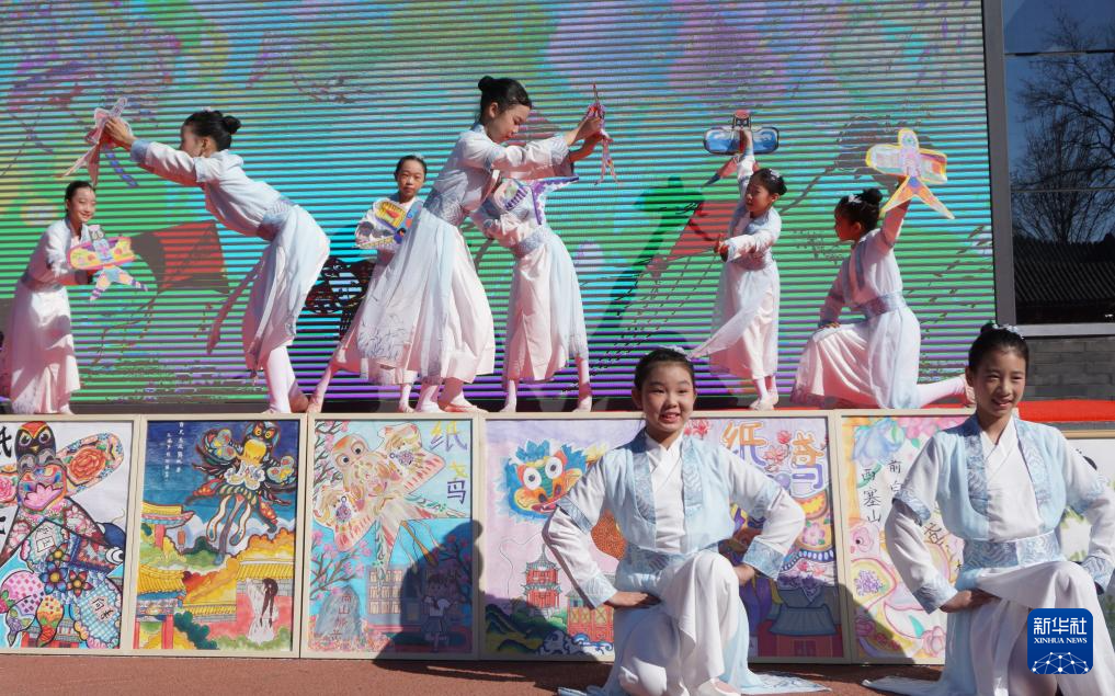 3月24日,府学胡同小学学生在书画摄影展开幕式上表演歌舞。