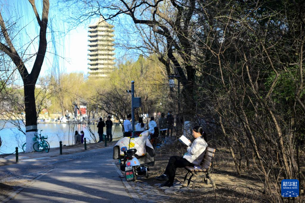 =一名女子在北京大学未名湖畔阅读(3月20日摄)。