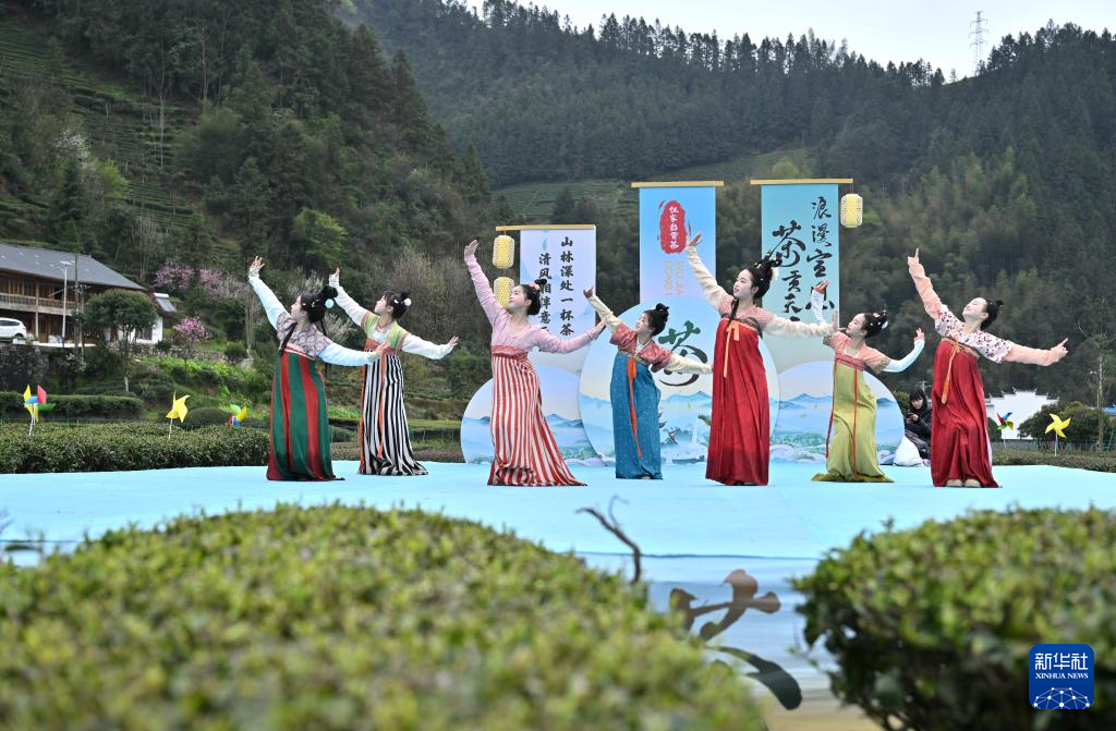 3月30日,身着传统服饰的姑娘在宣恩县椒园镇庆阳古街的茶园里翩翩起舞。