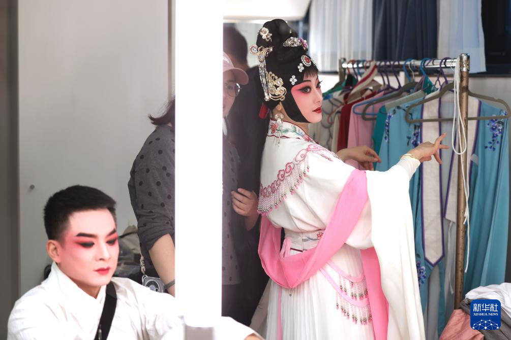 4月5日,在奥地利首都维也纳,演员在婺剧《白蛇传》演出前准备。