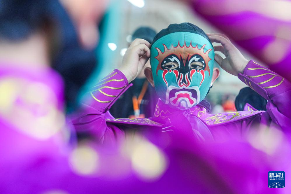 4月9日,在重庆市北碚区水土小学川剧排练室,一名参加川剧变脸演出的孩子在整理头饰。