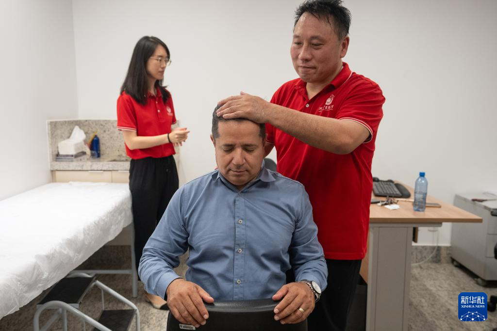 4月9日,在巴西戈亚斯州首府戈亚尼亚,中医孔子学院的老师为一名体验者进行推拿。