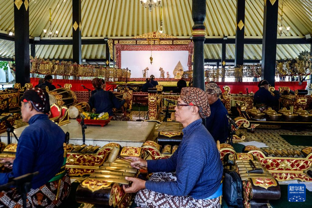 1月9日,在印度尼西亚日惹,皮影师在表演哇扬戏,乐手在一旁伴奏。