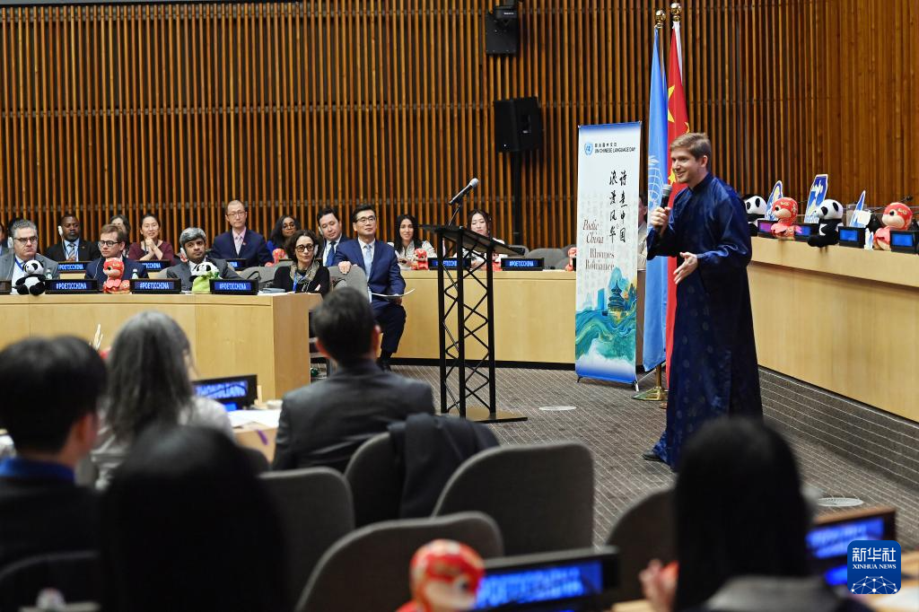 4月15日,在位于纽约的联合国总部,来自联合国全球传播部的美国青年扎克·丹茨在2025年联合国中文日活动上朗诵《周易》片段。