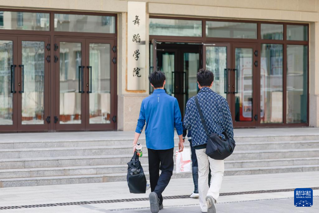 4月14日,罗昊(左)和同学一起走向舞蹈学院教学楼。