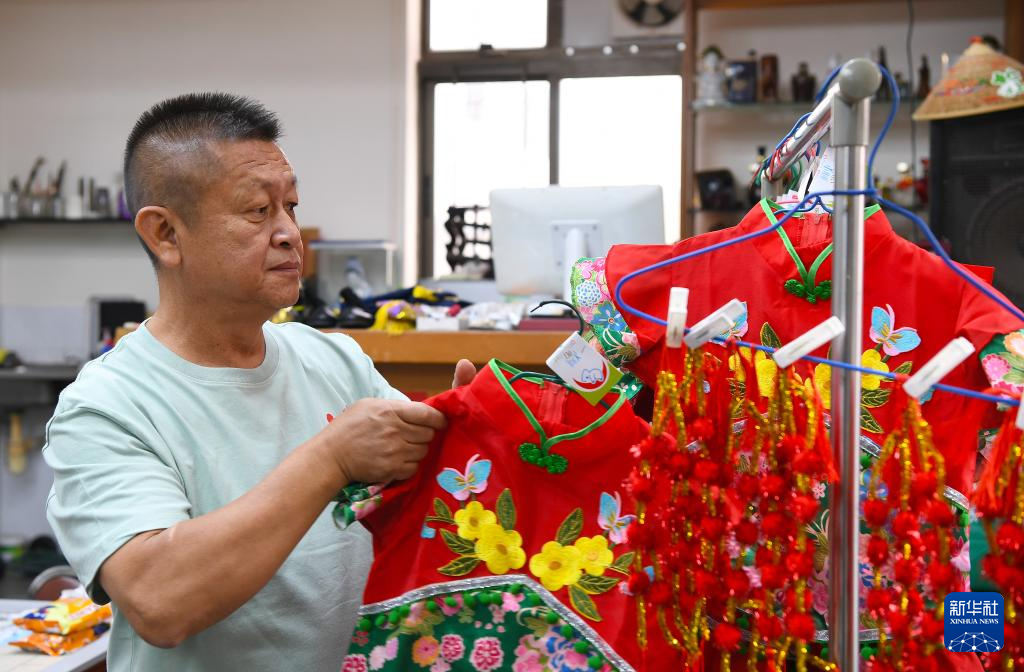 4月30日,飘色师傅李智伟在整理小演员的服饰。
