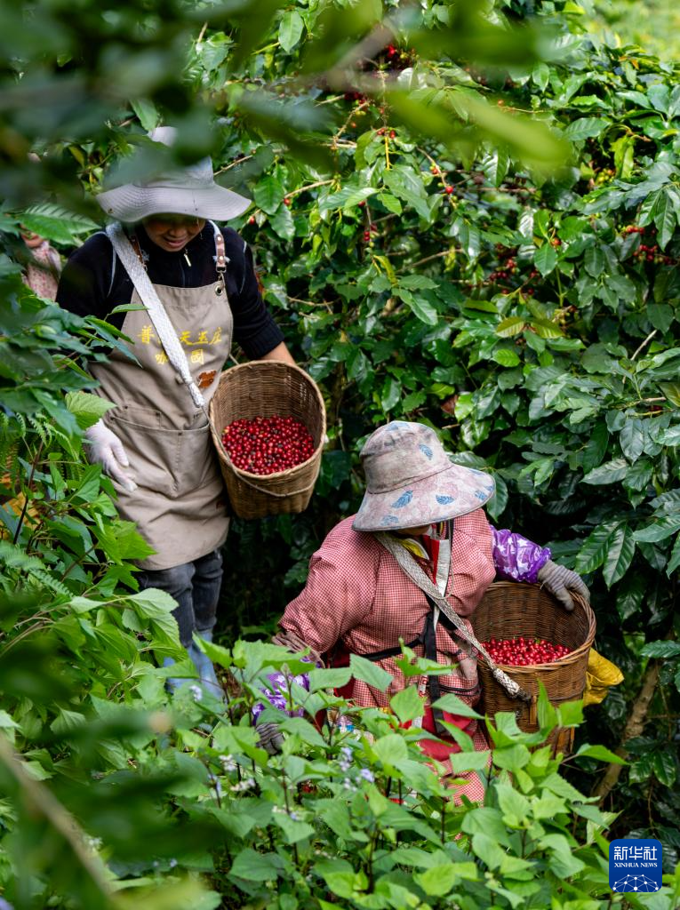 咖农在云南省普洱市思茅区天玉咖啡庄园采摘咖啡果(2025年1月8日摄)。