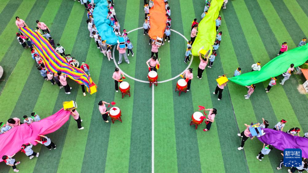 5月23日,在山东省东营市广饶县李鹊镇中心幼儿园,小朋友在进行龙舟赛游戏(无人机照片)。
