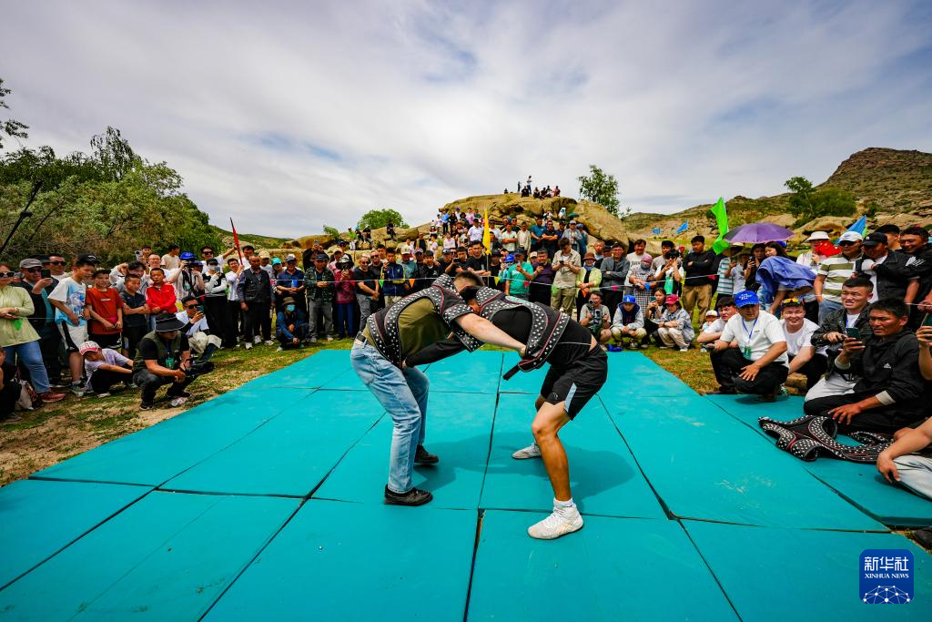 5月24日,在新疆阿勒泰市汗德尕特蒙古族乡,选手参加摔跤比赛。