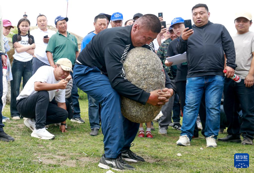 5月24日,在新疆阿勒泰市汗德尕特蒙古族乡,选手在参加抱石头比赛。