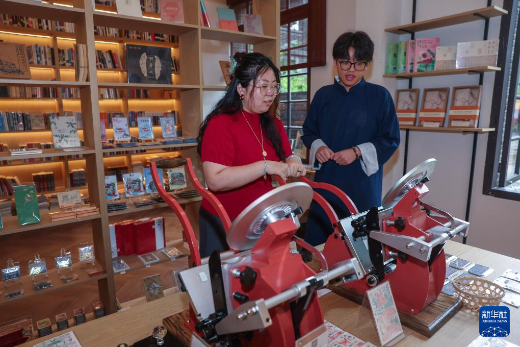 6月10日,游客(左)在子城欢喜书店一楼的中华书局体验活版印刷互动项目。