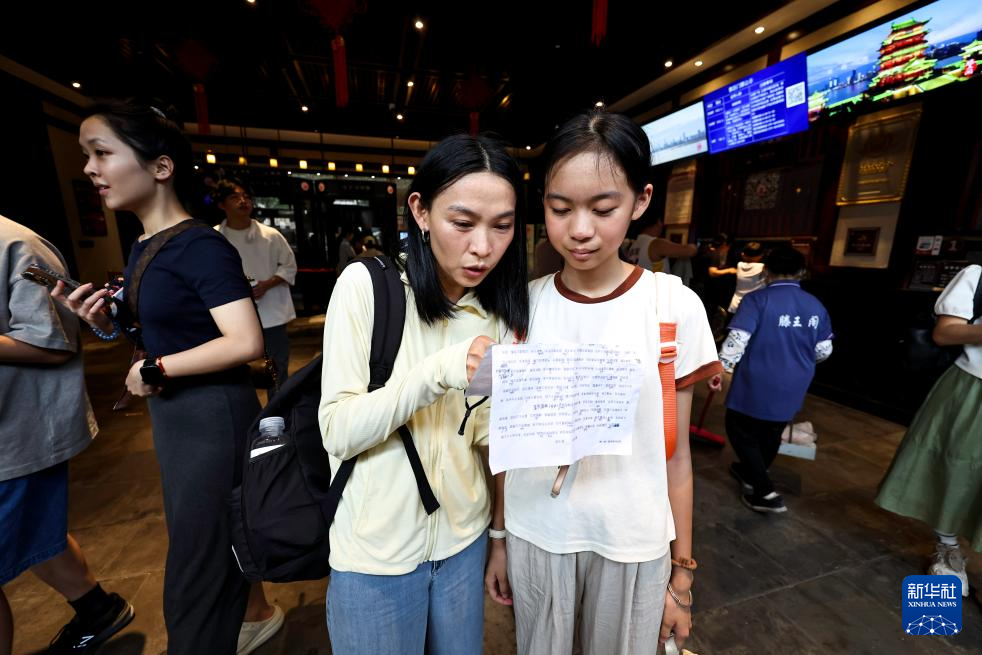 7月7日,一位来自广东东莞的母亲拿出打印好的《滕王阁序》,帮助女儿温习巩固,期待背诵通关。近年来,滕王阁景区推出背诵《滕王阁序》全文免门票活动,吸引了各地游客前来挑战。