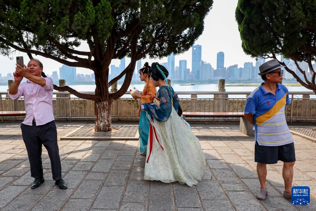 7月7日,身着古装的游客在江西南昌滕王阁景区游览留影。
