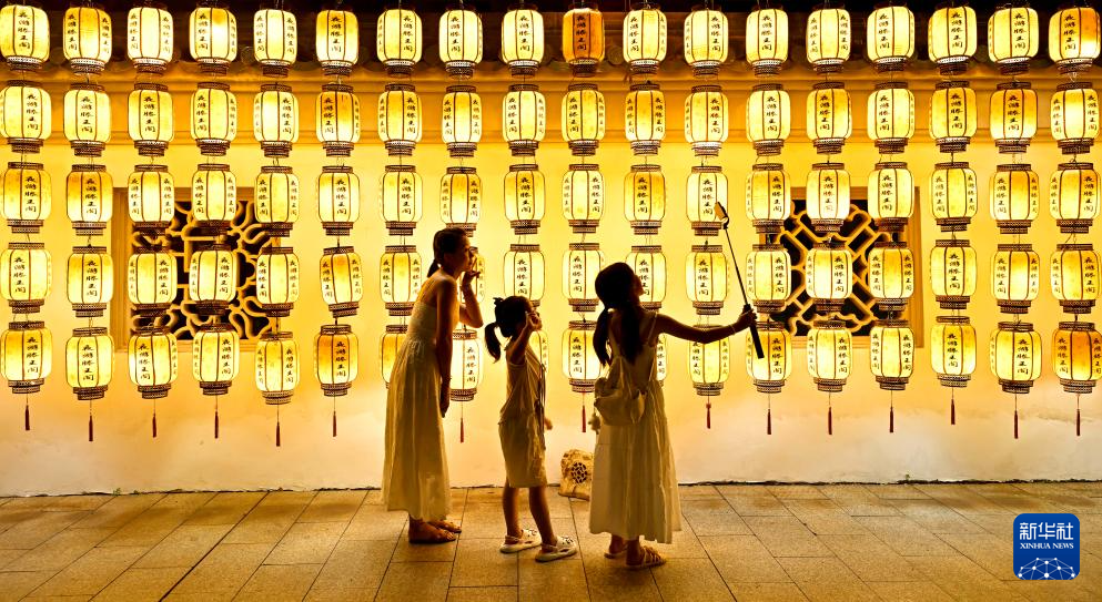 7月7日,夜间游览的游客在江西南昌滕王阁景区内打卡留影。
