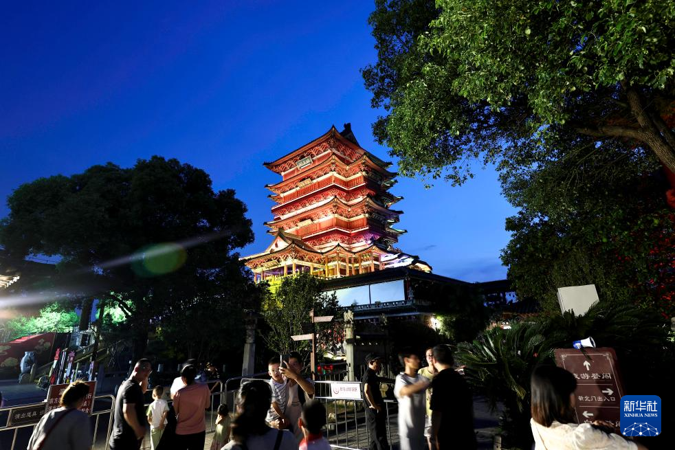 7月7日,夜间游览的游客在江西南昌滕王阁景区内排队等待登阁。