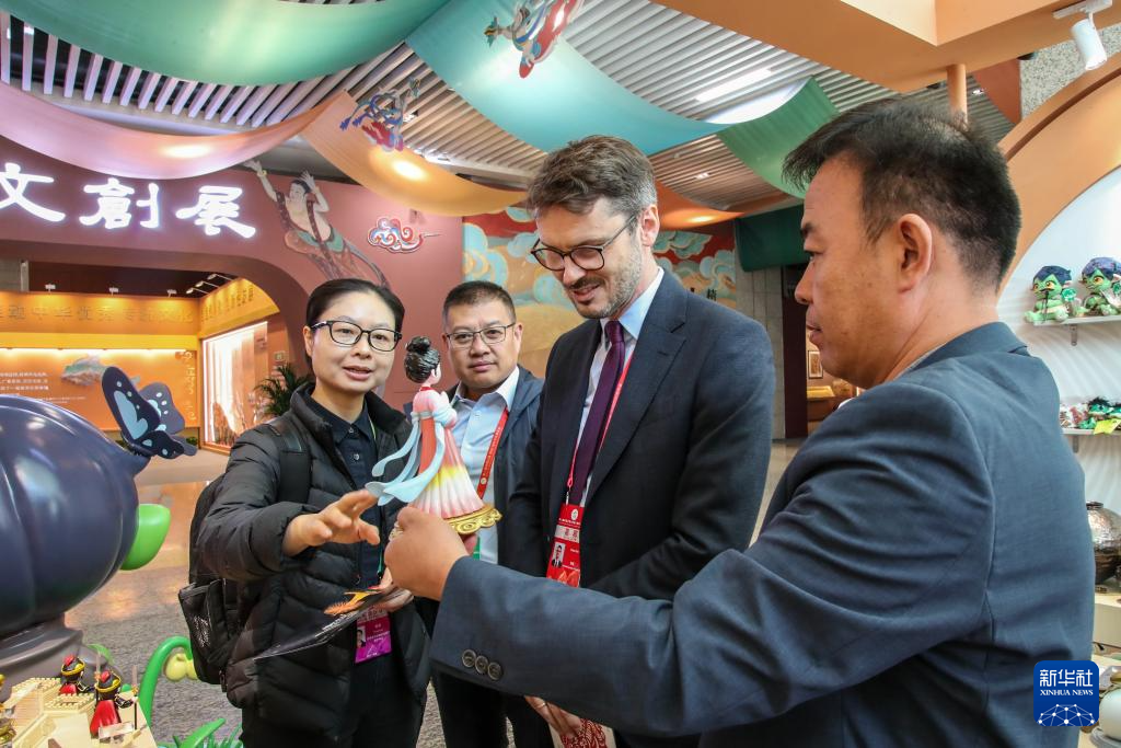 9月21日,与会嘉宾在第八届丝绸之路(敦煌)国际文化博览会上参观甘肃文旅非遗文创展。