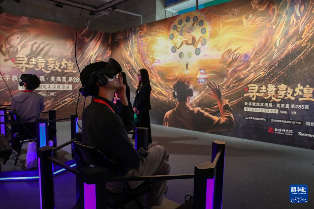 9月21日,在第八届丝绸之路(敦煌)国际文化博览会上,与会嘉宾借助VR设备沉浸式游览莫高窟虚拟场景。