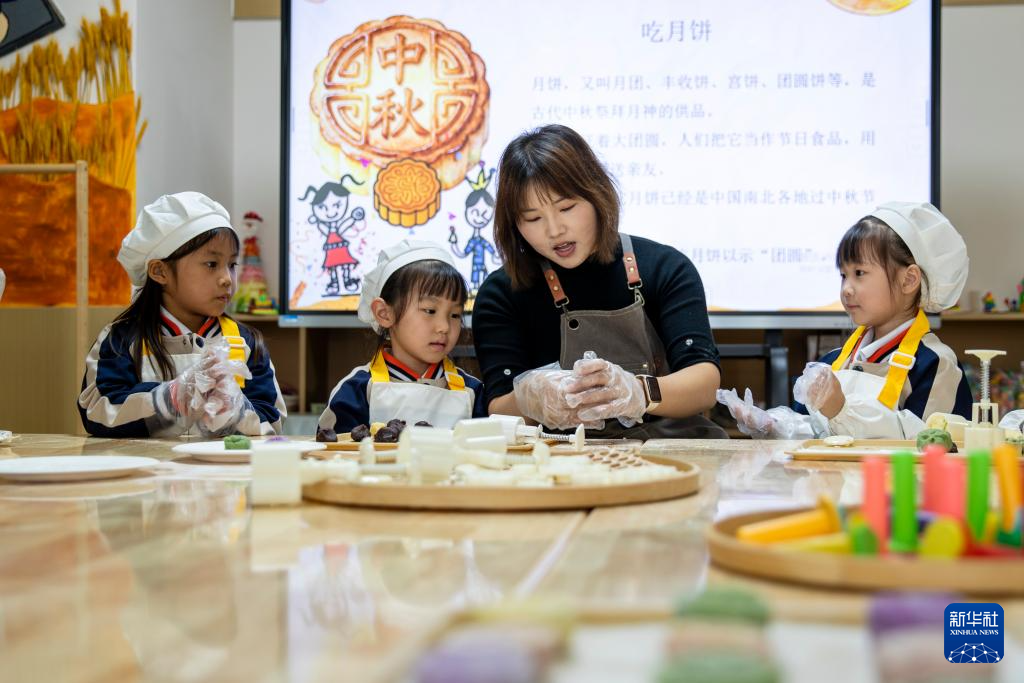 9月29日,在河南省商丘市睢县古襄路幼儿园,小朋友们在老师的讲解下学习制作冰皮月饼,了解中秋习俗。